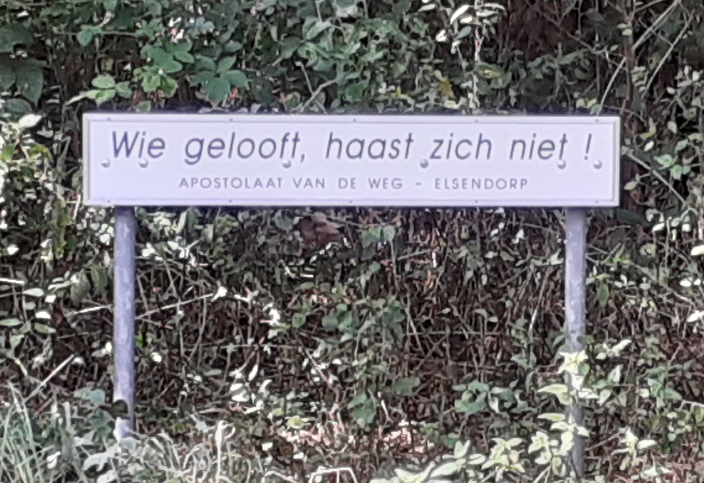 De spreuk is namens het Apostolaat van de weg geplaatst. Het doel van het Apostolaat is alle weggebruikers te activeren tot Christelijke naastenliefde bij verkeersdeelname om zo het aantal slachtoffers te beperken.