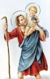 Sint Christoffel nam Christus op zijn schouder om hem over een woelige rivier te zetten. Hij is de patroonheilige van de reizigers.