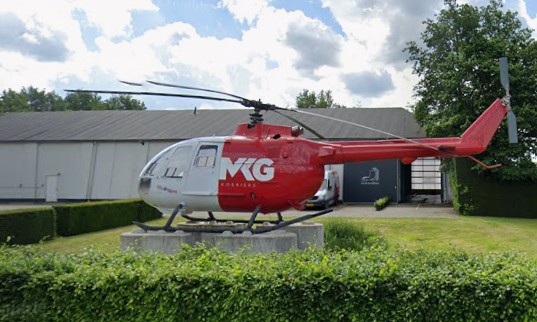De helikopter staat op het terrein van MKG-koeriers, een ware blikvanger langs de weg richting Boxmeer.