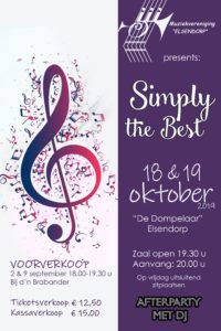 Muziekvereniging Elsendorp, zangers en zangeressen uit eigen dorp, combo en dans zijn reeds druk doende met de voorbereidingen om voor iedereen twee fantastische avonden neer te zetten. Het aftellen naar Simply the Best 2019 is begonnen. Alle deelnemers kijken met gezonde spanning en heel veel zin uit naar deze avonden, voorzien van professioneel licht en geluid.